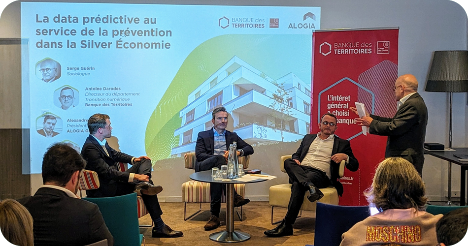 Le mercredi 15 mai 2024, la Banque des Territoires et ALOGIA Groupe, société à mission de la Silver Économie, ont co-organisé une table ronde sur la thématique de l’utilisation des données prédictives pour répondre aux enjeux du vieillissement. Introduite par Brice Paquet, Directeur régional adjoint Nouvelle-Aquitaine de la Banque des Territoires, et animée par Serge Guérin, sociologue expert du vieillissement, cette table ronde a permis d’ouvrir le débat entre Antoine Darodes, Directeur du département Transition numérique de la Banque des Territoires, Mario Bastone, Directeur général d’ÉNÉAL groupe Action Logement, et Alexandre Petit, Président ALOGIA Groupe.